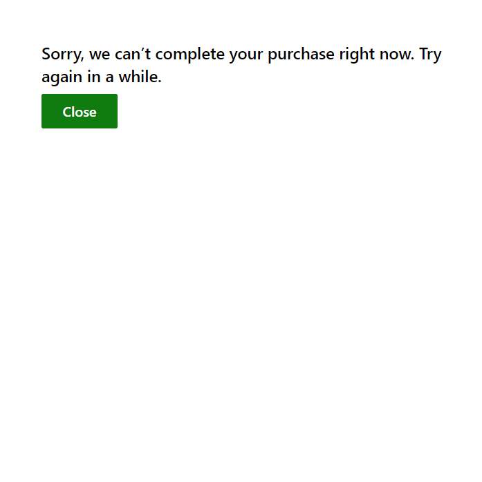 Hi, on minecraft.net windows 10 bedrock purchase area, when I click the buy button, it pops up a message saying "Sorry, we can’t complete your purchase right now. Try again in a while." It has been a day since this happened.