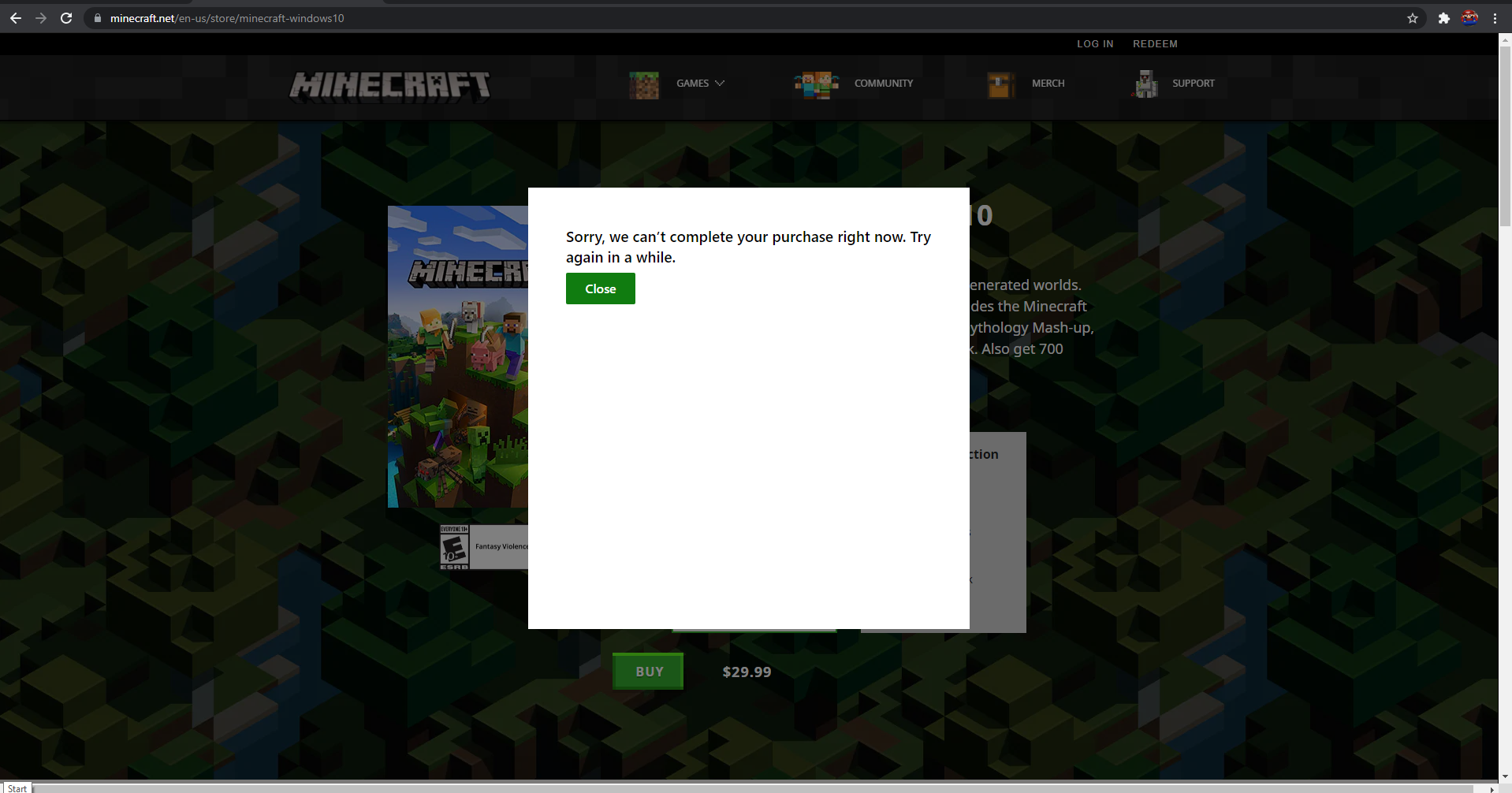 I tried to get Minecraft Windows 10 Edition on my computer, but I keep getting this message when I click the buy button. I haven't put any of my card details in yet, so I don't know what the problem is. I've waited around 2 hours, and it still hasn't been fixed.
