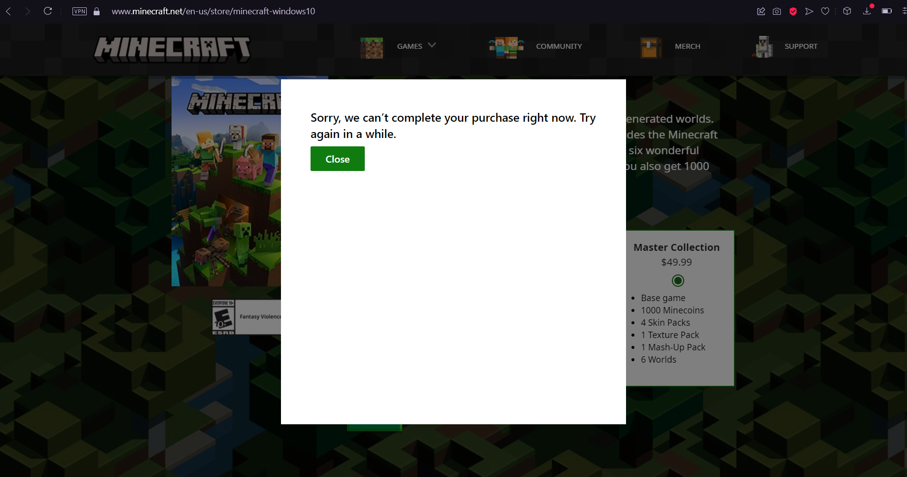 Every time i try to buy the Minecraft Windows 10 edition Master Collection is just pops up with this screen (check the attached image)