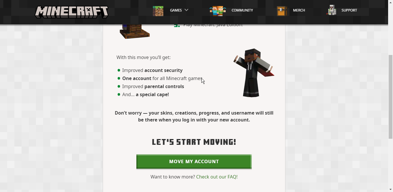 When I press "Move my Account" it redirects me to https://www.minecraft.net/en-us/account-security then that redirects me back to https://www.minecraft.net/en-us/profile.