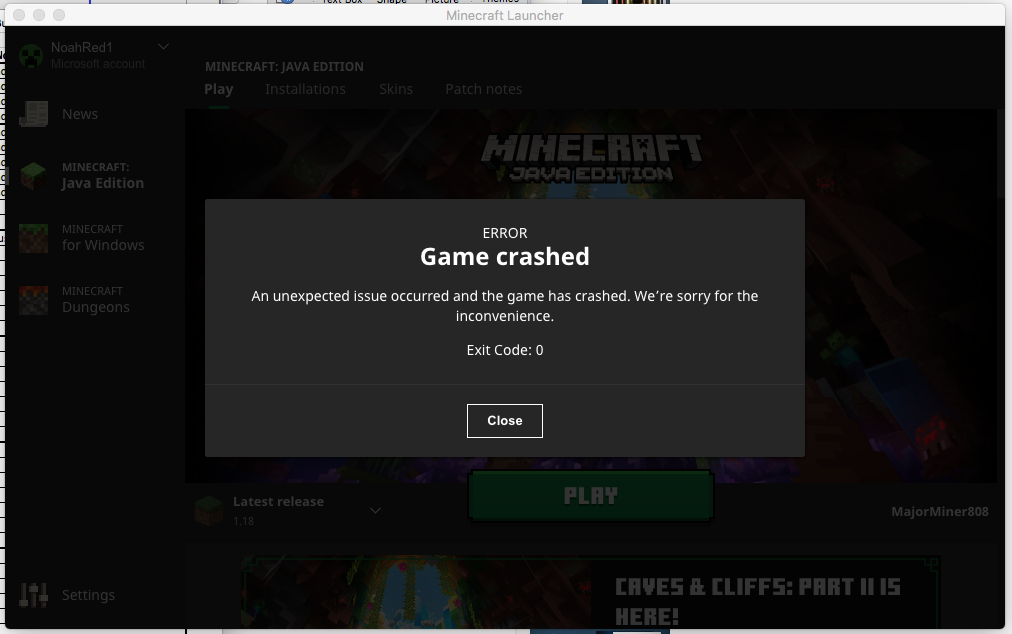 Minecraft 1.18 crashes after clicking "PLAY" on launcher. I'm on Mac OS 10.11.6. Very disappointing start for the exciting new update ...and after waiting 4 weeks prior for the Launcher bug to be fixed. "Error: Game crashed. An unexpected issue occurred and the game has crashed. We're sorry for the inconvenience. Exit Code: 0"