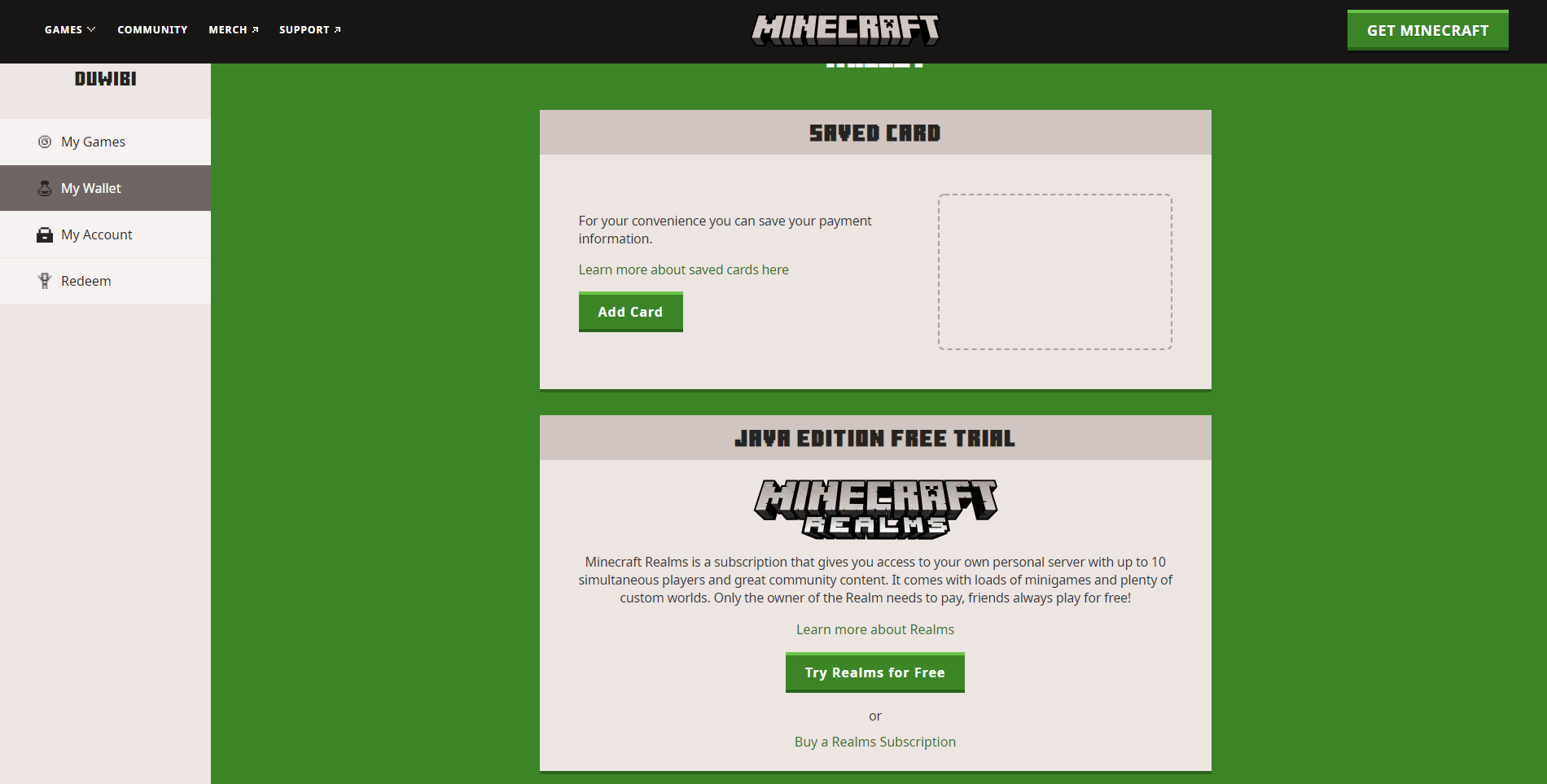 The new minecraft account GUI for buying minecraft realms does not work. The "Try realms for free button simply redirects you back to the same page.