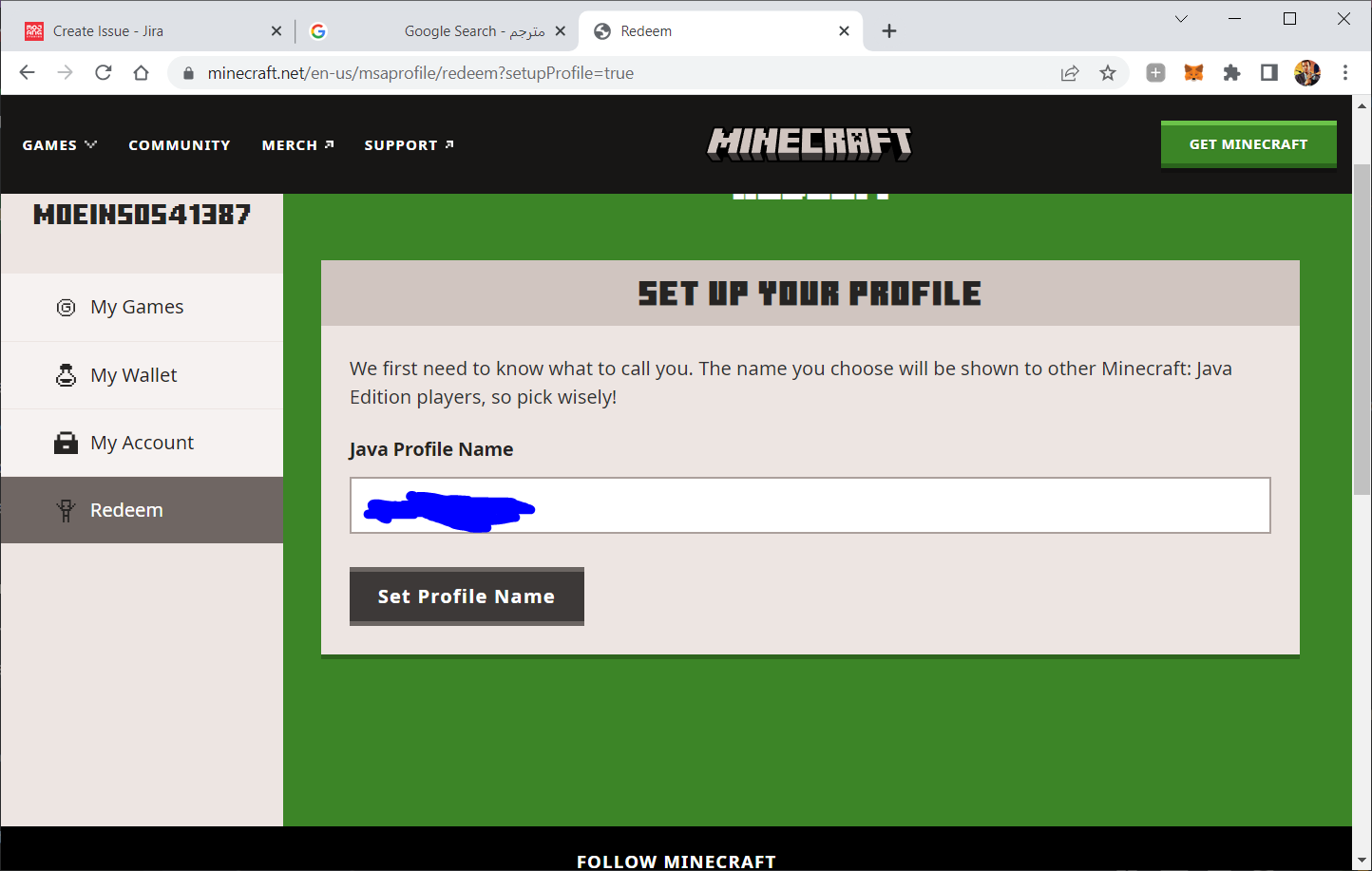 Hi, I bought the Java Minecraft game a few days ago, and when setting up a username on minecraft.net, the set profile button turns gray and nothing happens.