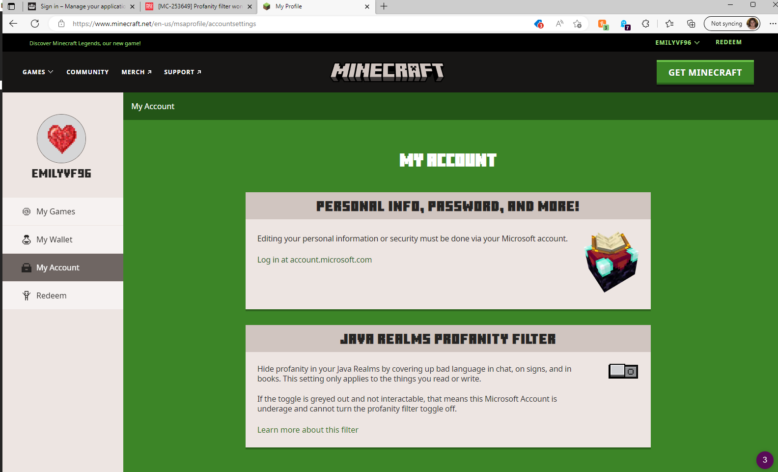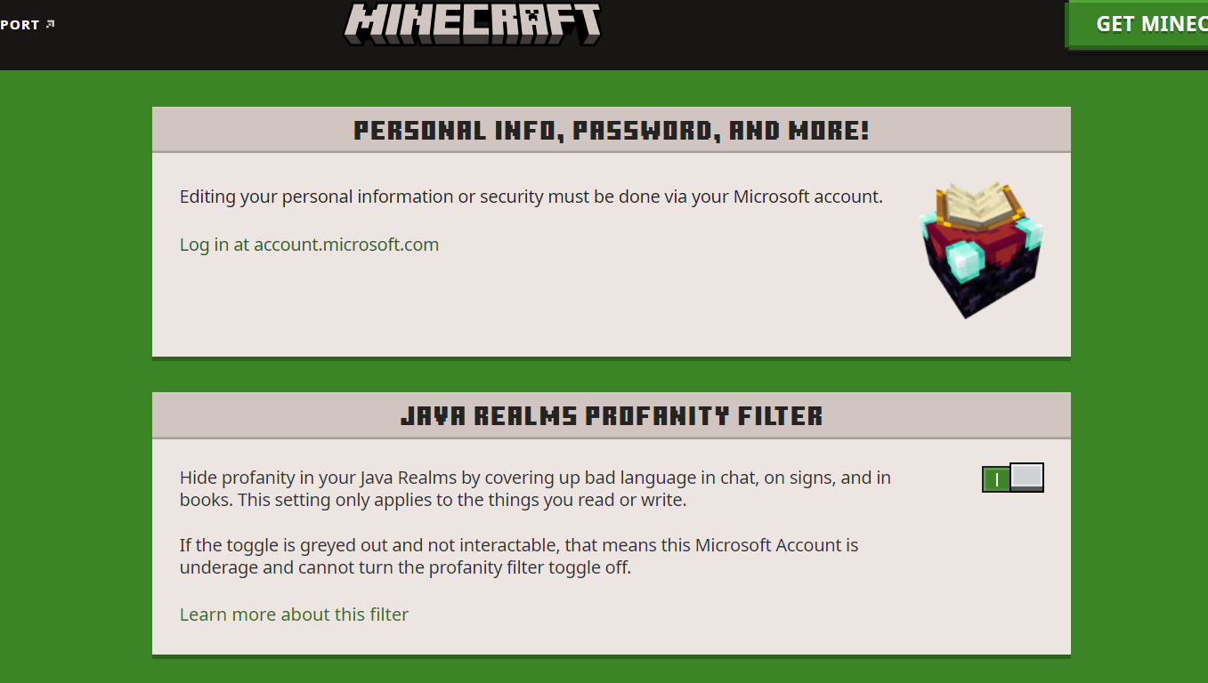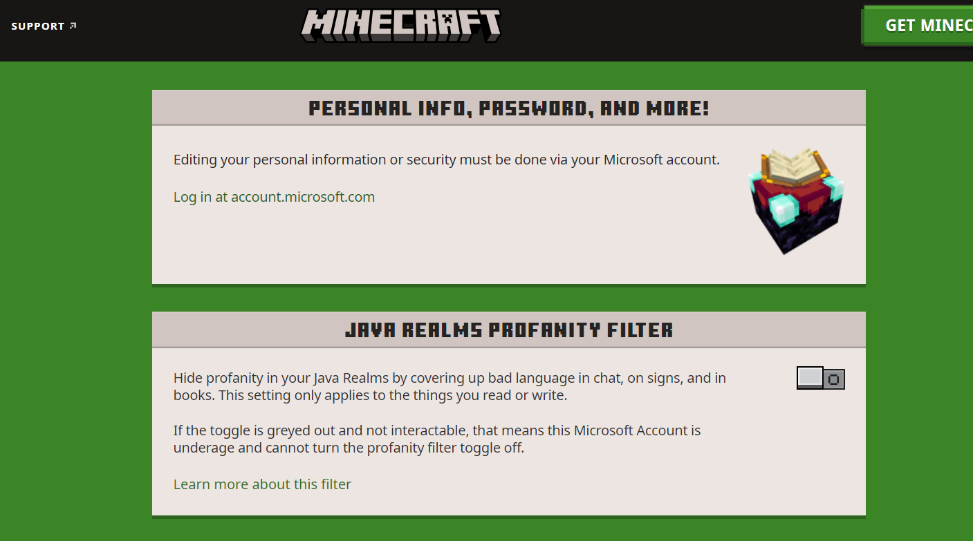 Hello I have tried to switch off the profanity filter on my account and it won't let me. It just stays greyed out. I have tried contacting minecraft support and microsoft support and they have advised I raise this as a bug as they have both tried to help me and no solution has been found. My account is an adult account and my settings are all correct so I am unsure as to why I can't switch the profanity filter off.