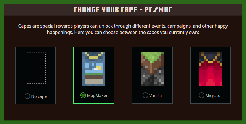 In the past, the cape icons would display their textures, however, this is no longer the case. Please note that you must have at least one cape attached to your account in order to reproduce this problem.