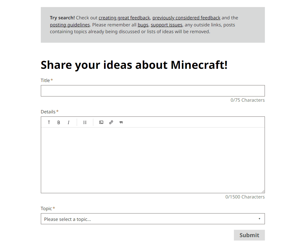 When entering a title on the feedback site, after a few seconds the text area and submit button disappear and are entirely replaced by search results of related posts. After that, it is no longer possible to provide details or hit the submit button.