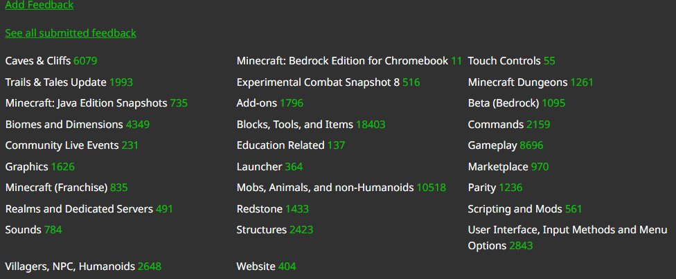 The Minecraft Legends category doesn't appear in the Categories section of the Feedback site