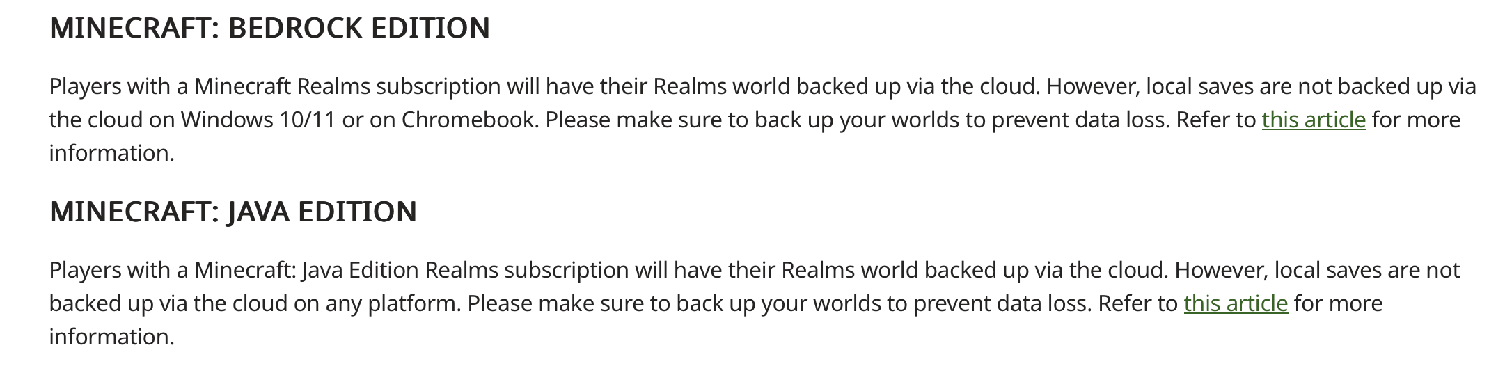 The link for Minecraft: Java Edition where people can get to know how to backup is same as one for Minecraft: Bedrock Edition. (And that article they linked is about transferring worlds in Minecraft: Bedrock Edition ("How To Transfer Your World To Another Device In Minecraft: Bedrock Edition"))