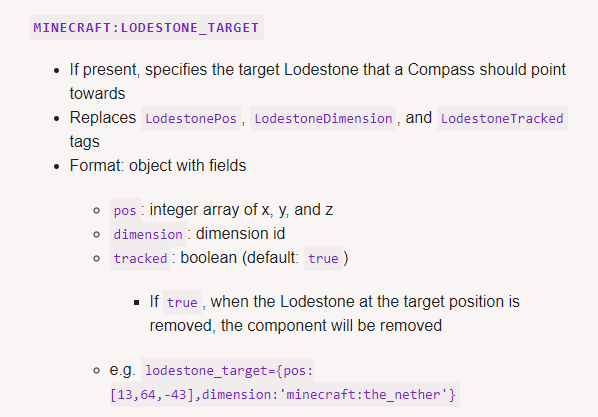 The Item Stack Component 'lodestone_tracker' is documented and announced as 'lodestone_target' in the 24w09a Snapshot article.