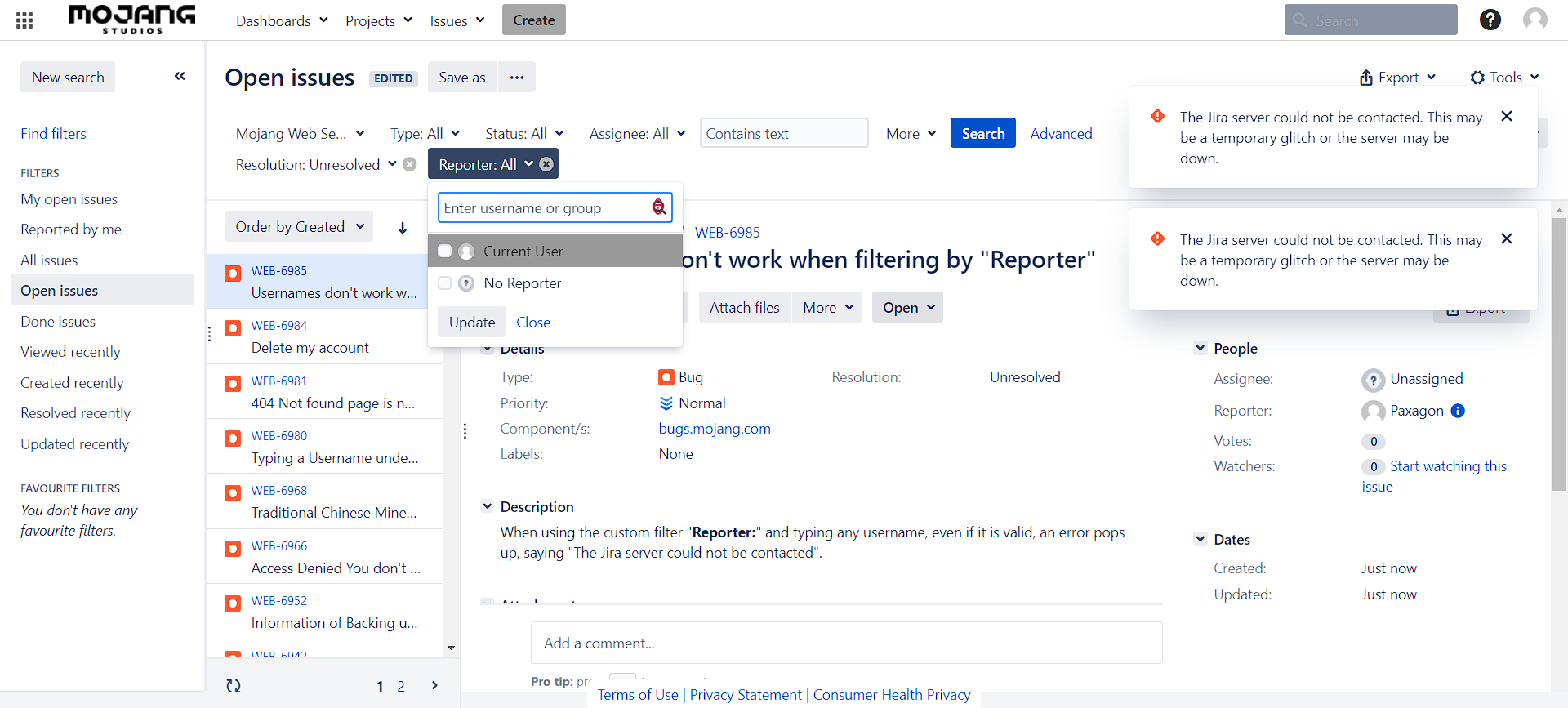 When using the custom filter "Reporter:", "Assignee:" or "Creator:", typing any valid username, and updating, an error pops up, saying "The Jira server could not be contacted".