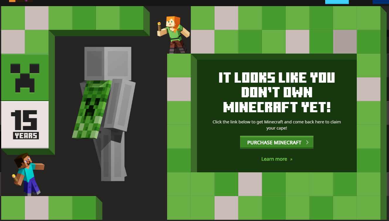 I can't pick up the cape in honor of the 15th anniversary of minecraft. It says that I did not buy Minecraft but I bought it.