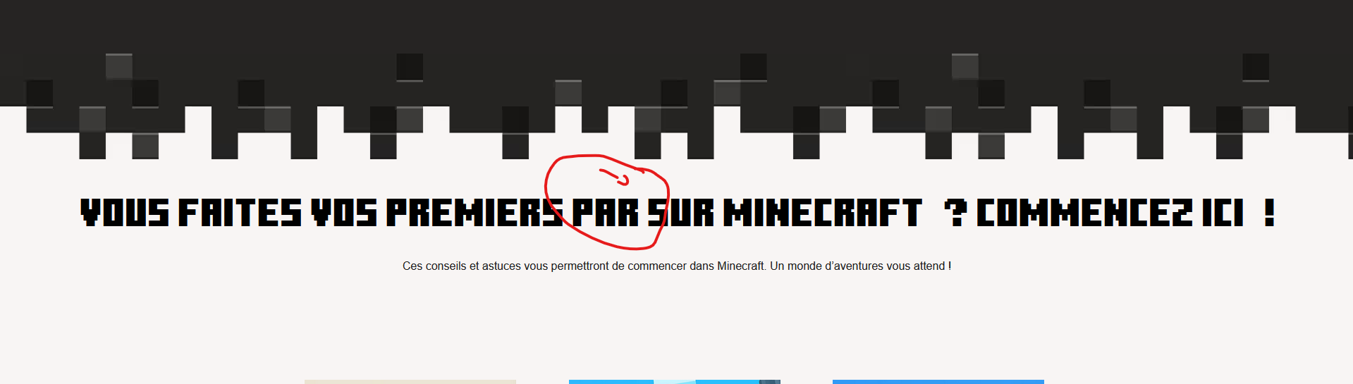 I recently found a translation bug on the minecraft.net page. It says "Vous faites vos premiers par sur minecraft ? commencez ici !" instead of "Vous faites vos premiers pas sur minecraft ? commencez ici !" (French version: https://www.minecraft.net/fr-fr/minecraft-tips-for-beginners ).