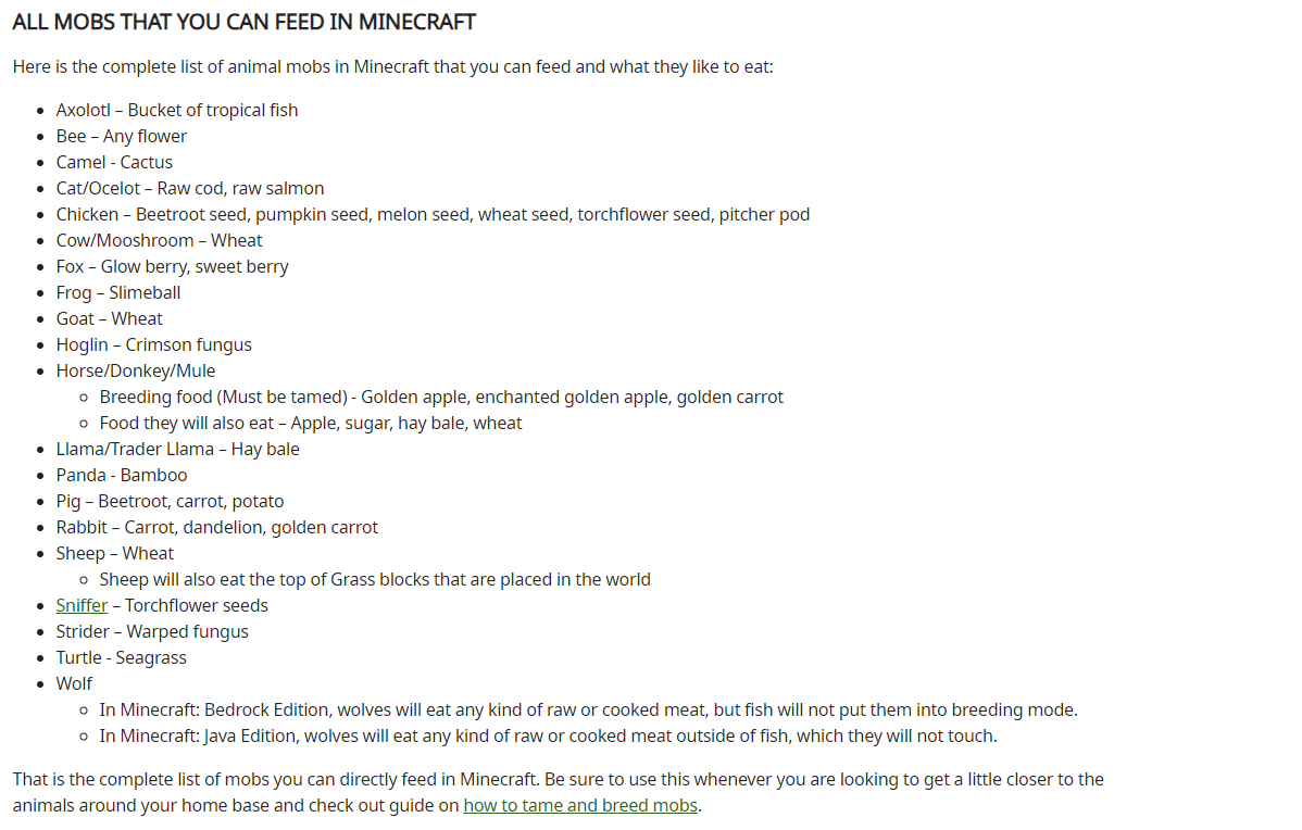 In Minecraft Help Center -> Gameplay/How to Guides -> Minecraft Game Guides -> What do mobs eat in Minecraft?, the new Armadillo mob which eats spider eyes is not mentioned in the list
