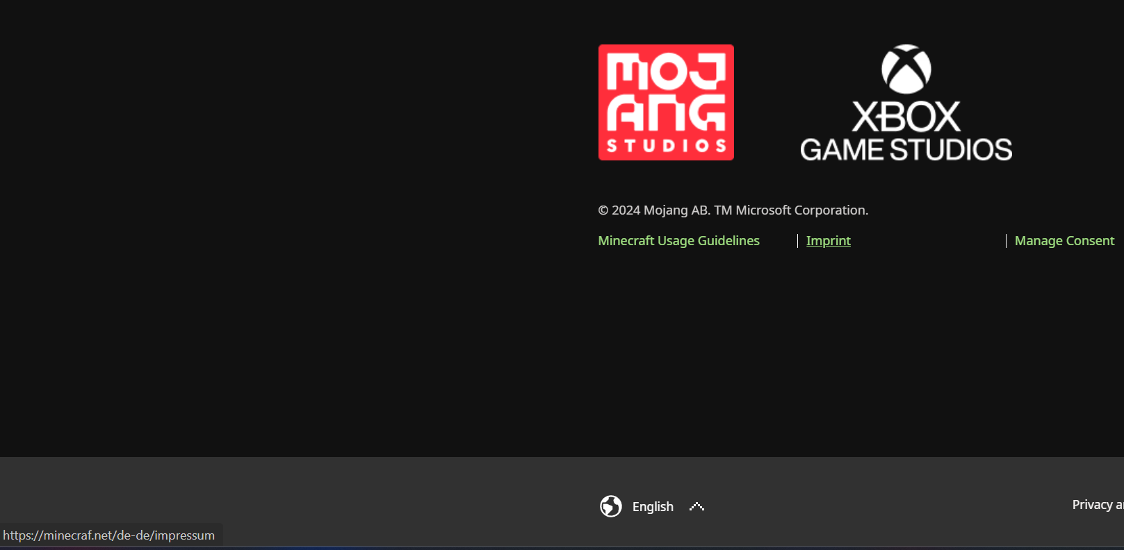 Other language versions of the main page, like https://www.minecraft.net/fr-fr or https://www.minecraft.net/nl-nl have the same broken imprint link using minecraf.netÂ