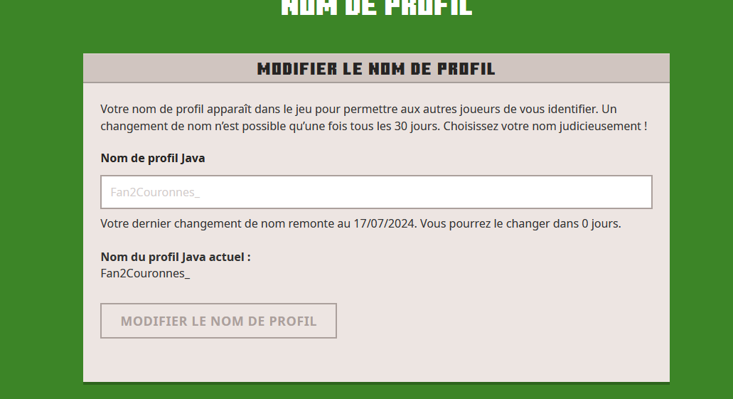in the nickname change page of minecraft: Java edition, the remaining time is displayed as “0 days”.