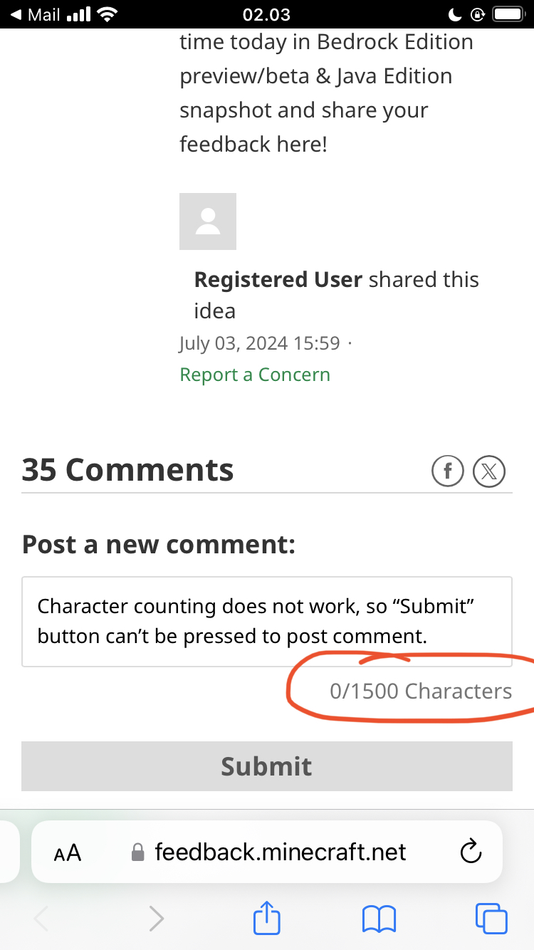 In Safari on iPhone the character counter on the feedback site does not work when writing a comment. As a result the "Submit" button stays deactivated, meaning you can't post comments.