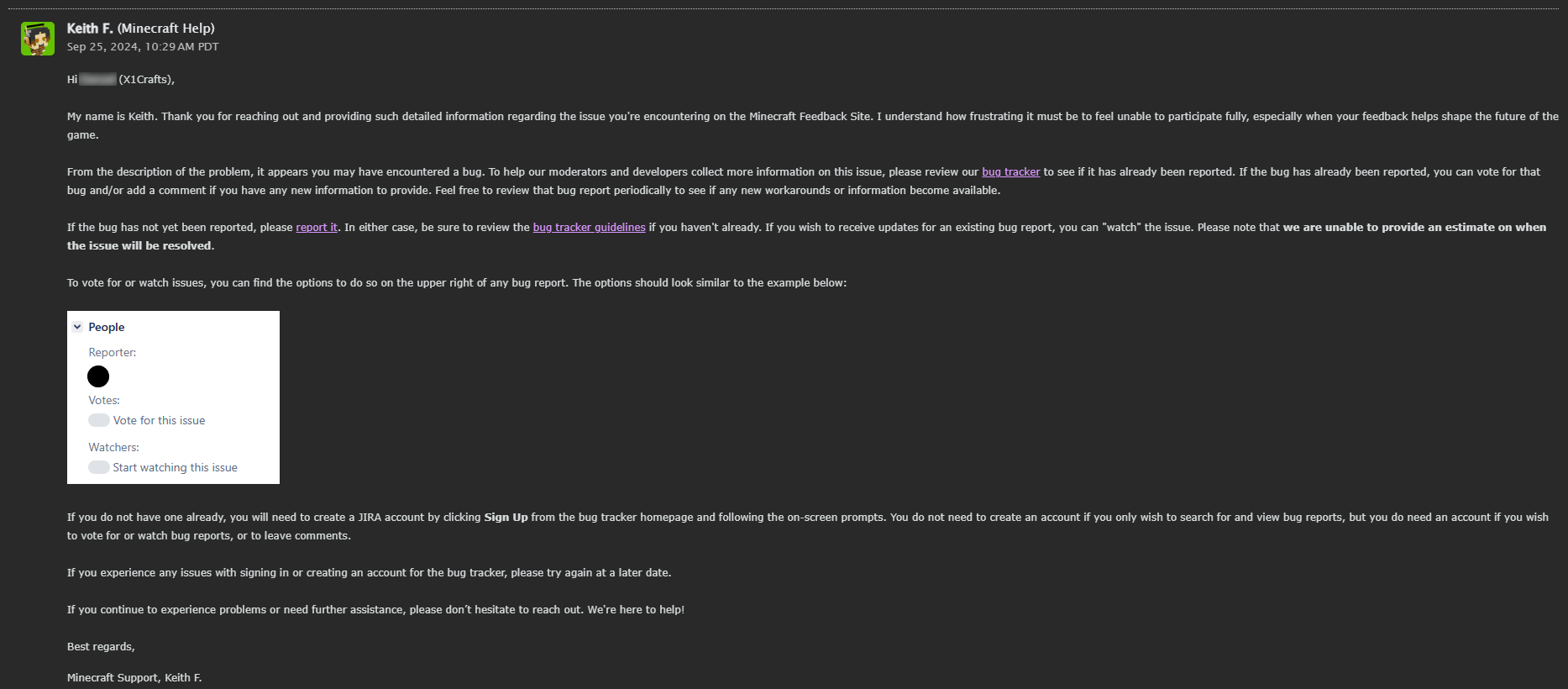 📓 Bug Tracker Guidelines – 💬 Community Support – 📧 Mojang Support (Technical Issues) – 📧 Microsoft Support (Account Issues)