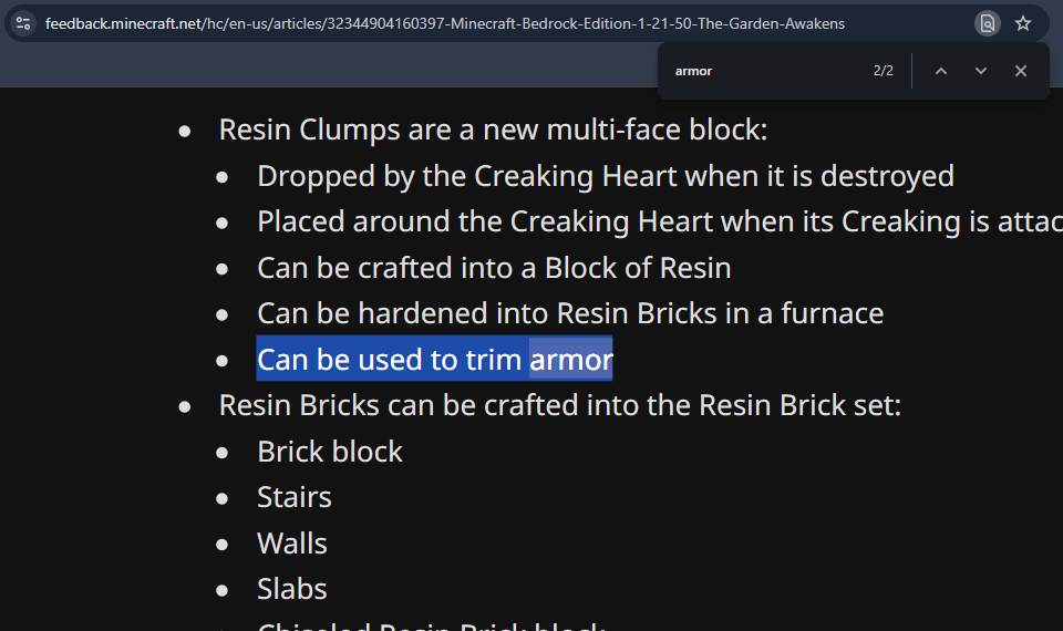 In Changelog 1.21.50, Which the "Resin bricks" text is missing for "Can be used to trim armor", To prevent confusing any players to read changelog