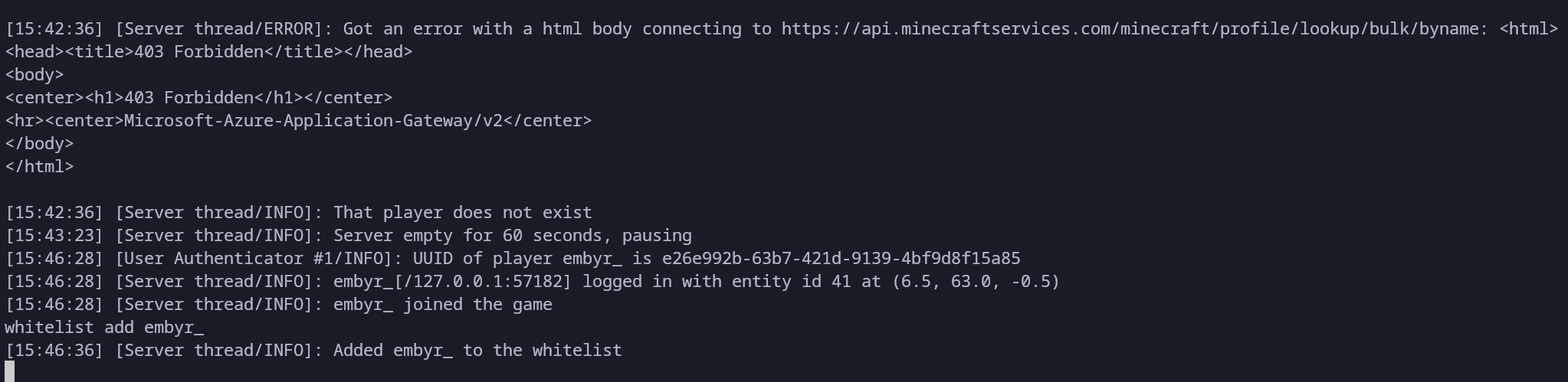 [15:01:33] [Server thread/ERROR]: Got an error with a html body connecting to https://api.minecraftservices.com/minecraft/profile/lookup/bulk/byname: <html>