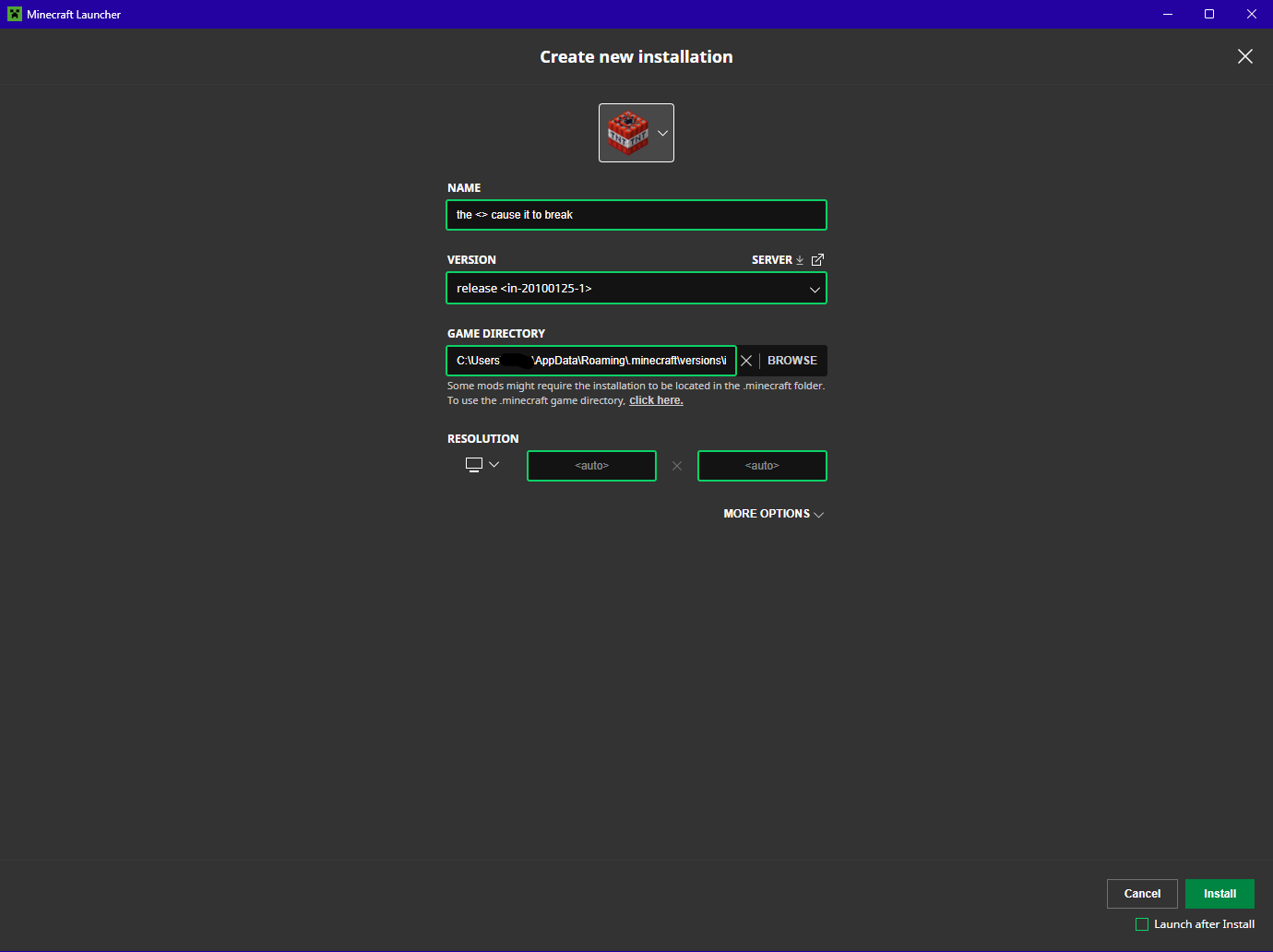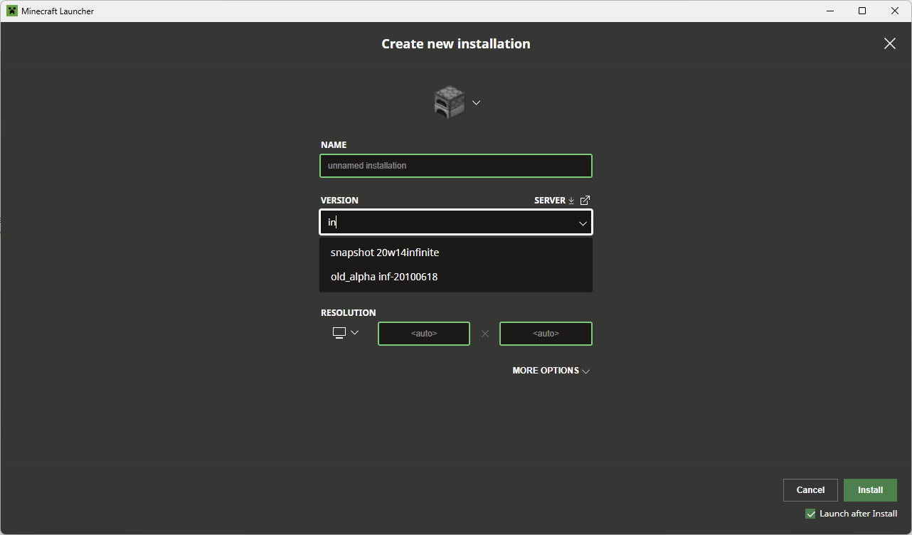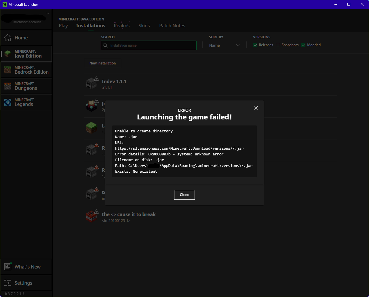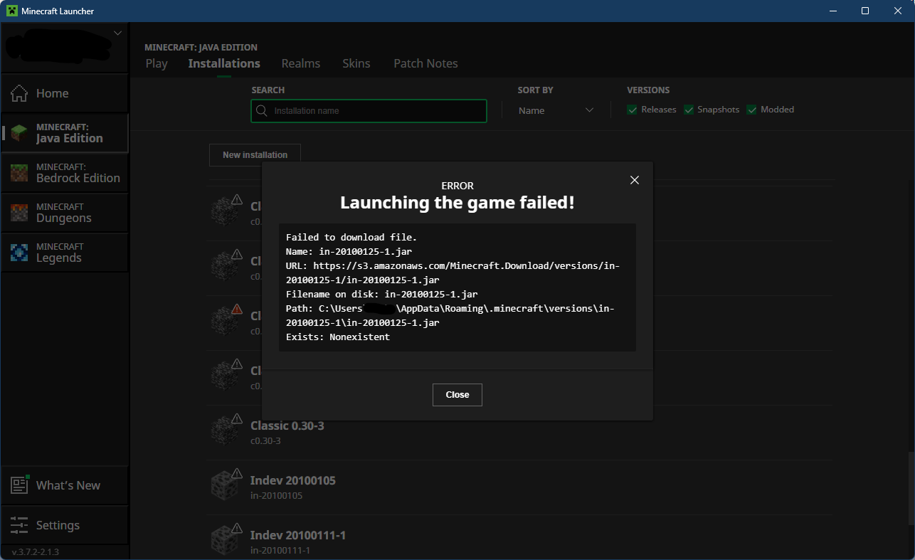 @Jarl-Penguin You could see the Error code was for in-20100125-1. However my copy is now bugged regarding in-20100125-1. In the "Create Installation" part of the launcher, the option for in-20100125-1 under Version has greater than and less than signs on it, like this: <in-20100125>. For some reason, these signs cause the installer to break, and I can no longer play in-20100125 on my device. I have reinstalled the Minecraft Launcher multiple times however it doesn't change. I couldn't find any other versions that have this issue.