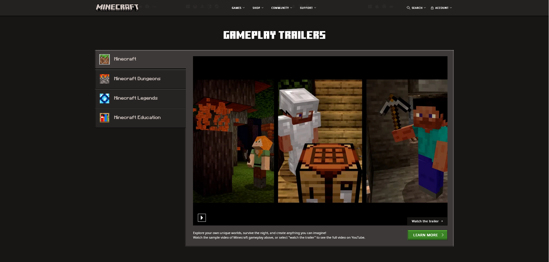 the latest actual Minecraft trailer (https://www.xbox.com/games/store/minecraft/9mvxmvt8zkwc) - more up to date than the one used on the website