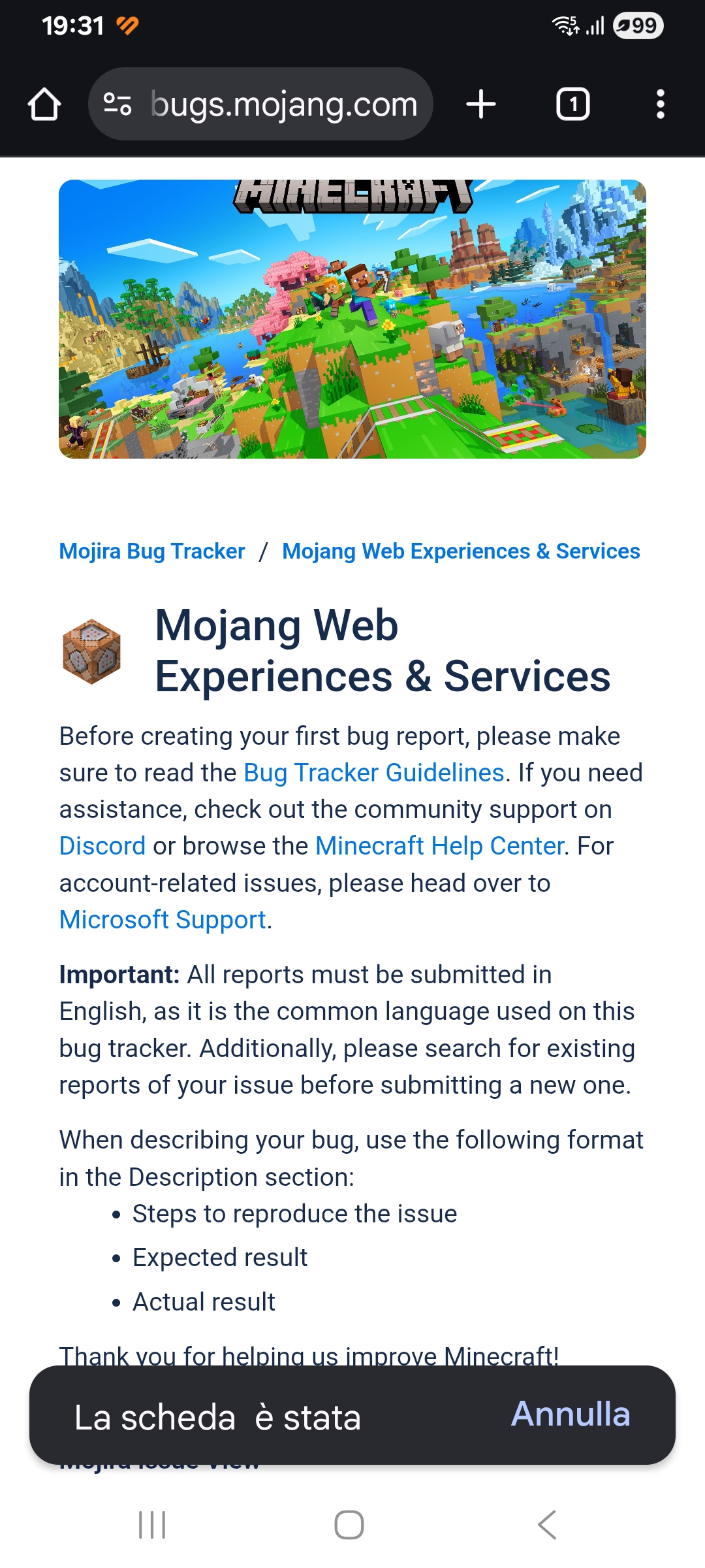 Open your preferred browser , then paste the url: https://bugs.mojang.com/ in your bar