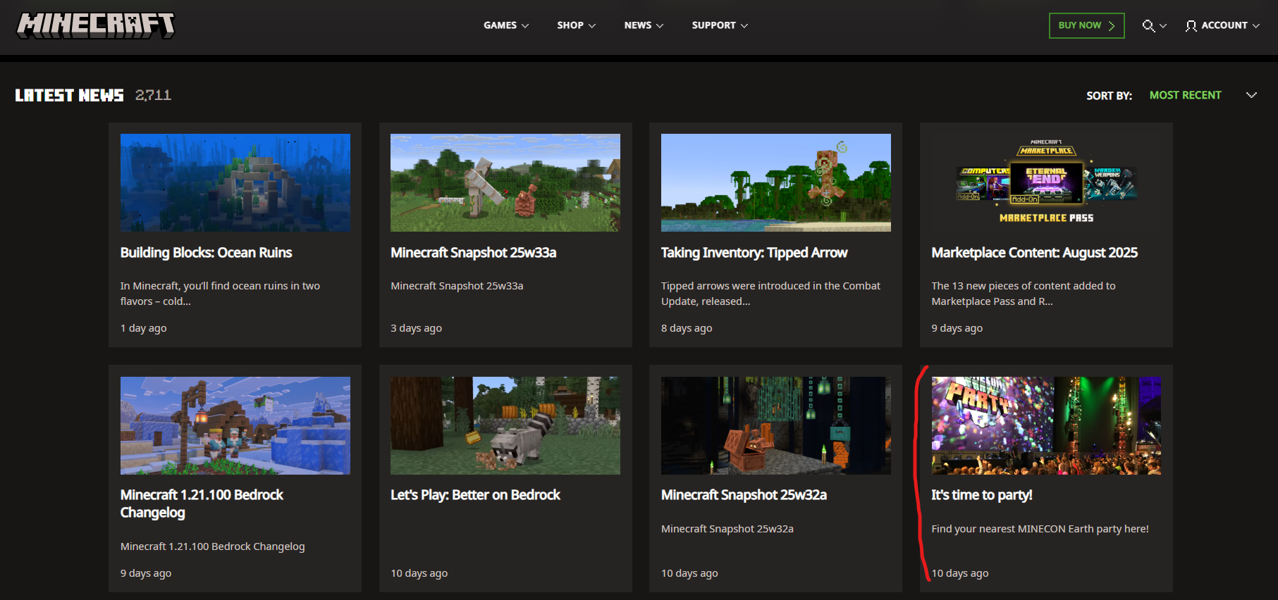 https://www.minecraft.net/en-us/articles shows that an article ‘It’s time to party' was published 10 days ago (at the time of writing this). This article was published in 2018 however.
