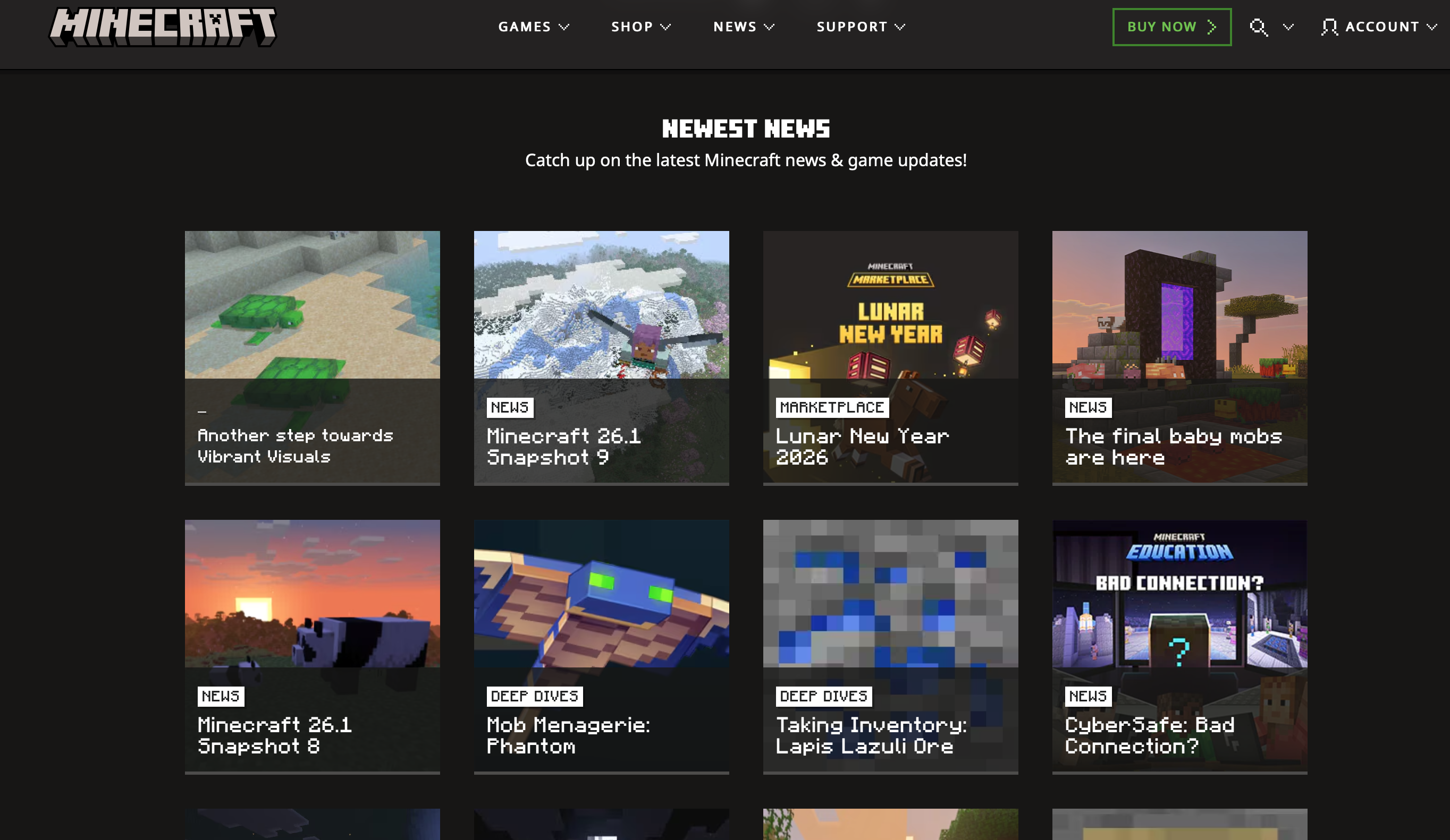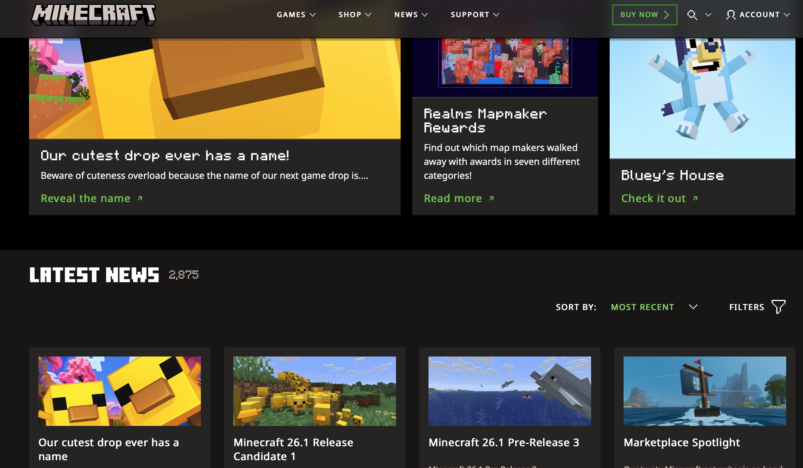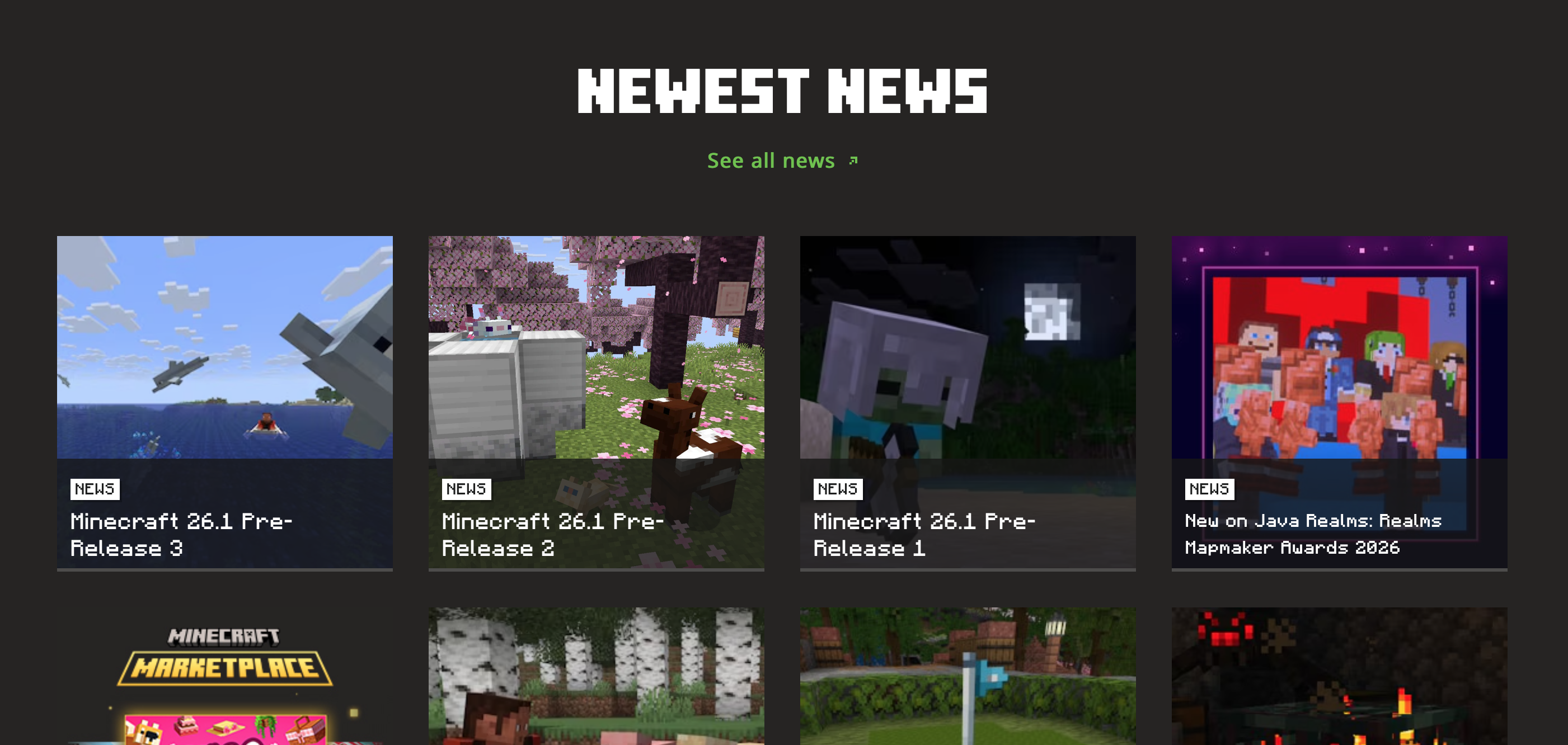 there are 3 main places that one can find news articles on the Minecraft website, and the bug that's happening for me is that the 3 different places don’t have the same “recent“ news articles. I will share 3 screenshots of the different areas. 1st: articles at the bottom of the main page. 2nd: articles on the “newest news“ tab. 3rd: articles at the bottom of an article. the articles at the bottom of the article have not changed for maybe 2 weeks, although the other ones have.